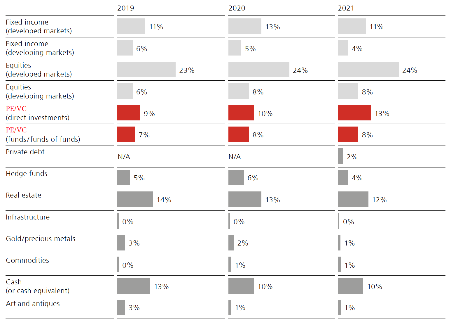 Family Offices increase their allocations to private equity and venture capital based on UBS’s 2022 Global Family Office report. It is notable that direct investments increase year-over-year since 2019 while allocations to funds and fund-of-funds stay around 8%.